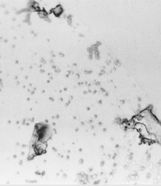4-prozentige Ascorbinsäurelösung nach 24 Stunden in abgeschirmter Umgebung: ohne den Eneraktiv sind Kristallstrukturen kaum fest feststellbar. Auch die für Kristalle typischen Interferenzfarben sind nicht erkennbar.